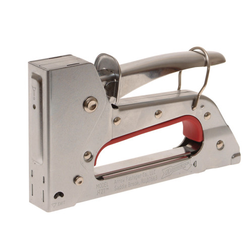 The Arrow JT27 Junior Staple Gun Tacker with all steel construction and chrome finish. A light-duty bottom loading staple gun ideal for use on upholstery and general use. The staple exit indicator aids the user when precision accuracy is required.