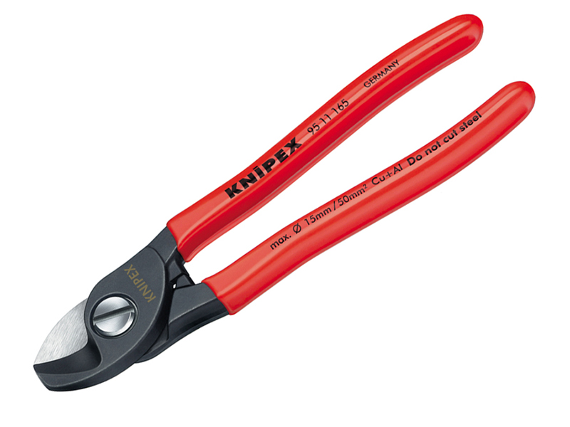 The Knipex 95 cable shears with dipped PVC handles are ideal for cutting copper and aluminium cables, single and multiple wire cables but are not suitable for steel wire and hard drawn copper conductors.