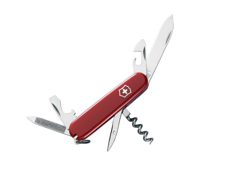 The Sportsman Swiss Army Knife has a large blade, a nail file with nail cleaner, a corkscrew, a can opener with a small screwdriver, a bottle opener with a screwdriver and wire stripper, a reamer/punch tool, tweezers, toothpick and a keyring.