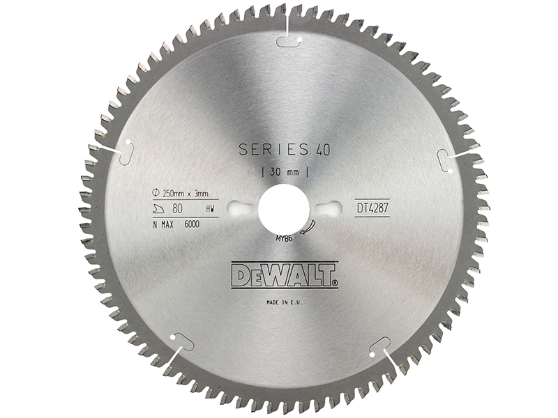 The DEWALT Series 40 Extra Fine Finish Circular Saw Blade is designed for use in stationary saws. With large, general purpose K10 carbide tips for cutting wood and non-ferrous metals. They can be resharpened up to 15 times.